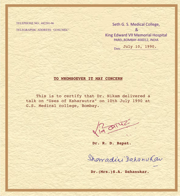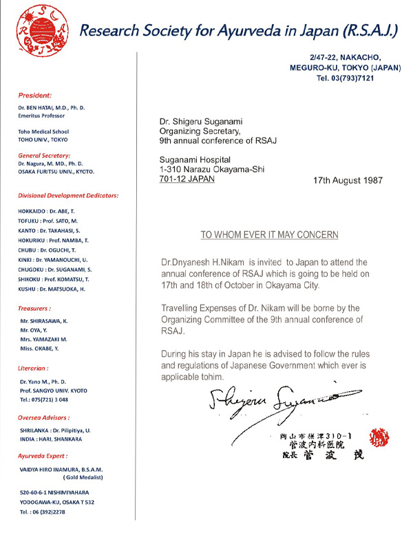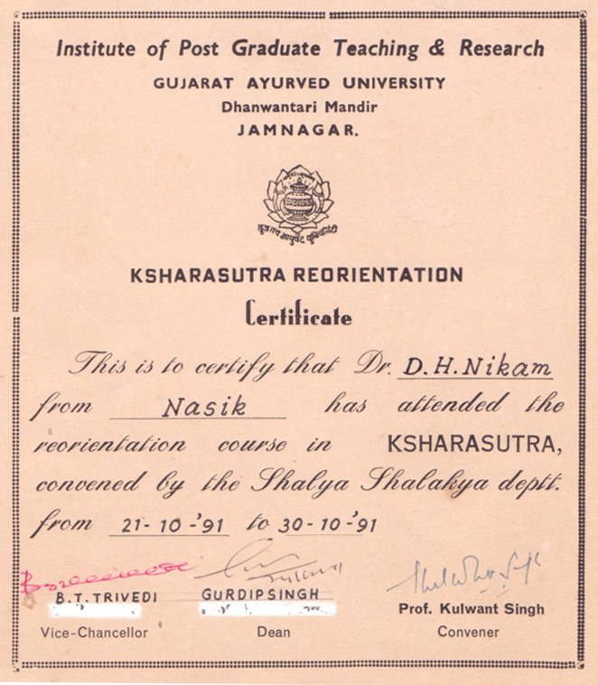 Paper Reading done before Research Society of Ayurveda in Japan at Okayama in 1987 on the Subject Ano Rectal Diseases and Ayurvedic treatment. Paper Reading done in All India Colo-Rectal Mid term Conference at Bombay Hospital in Sep 1991.