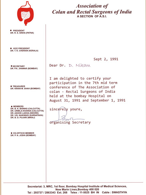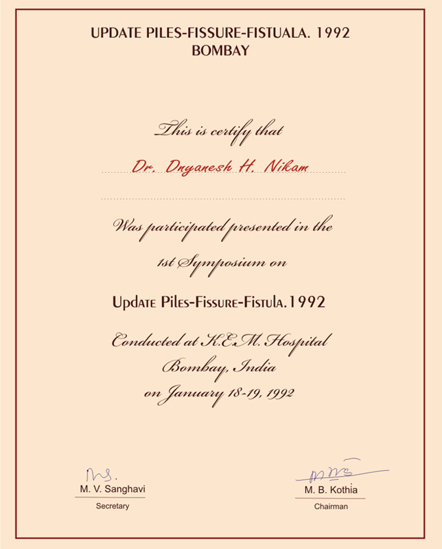Done Paper Reading at ASIAN MEDICAL DOCTORS ASSOCIATION, Conference at K.M.C. Medical College. Manipal Karnatka University Feb 1992. Won prizes for Paper Reading on "Ayurvedic Treatment of Fistula in ano" in 9th Annual Surgeons Conference Maharashtra. Feb.91.